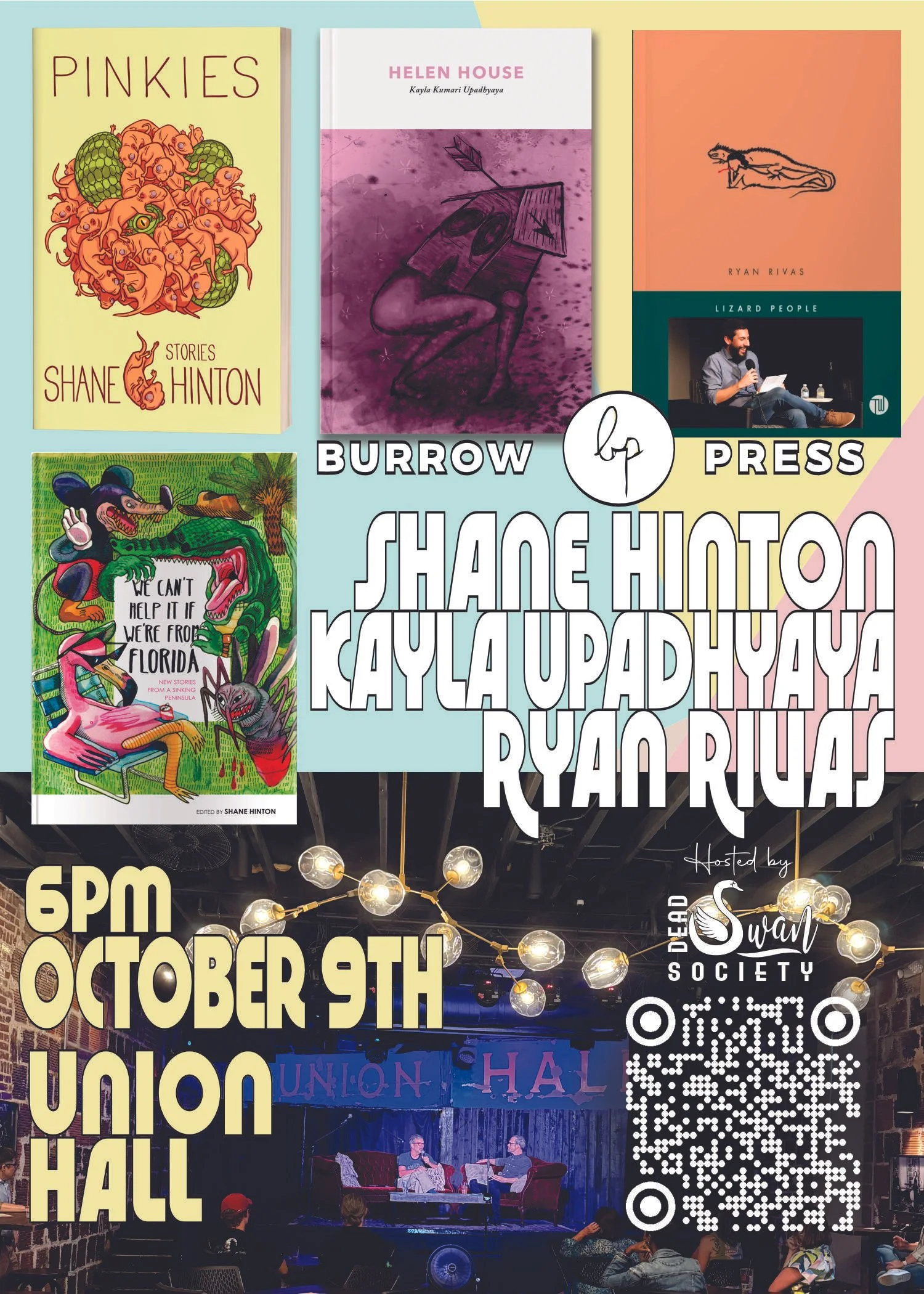 October 9th with Shane Hinton, Kayla Upadhyaya, and Ryan Rivas of Burrow Press
